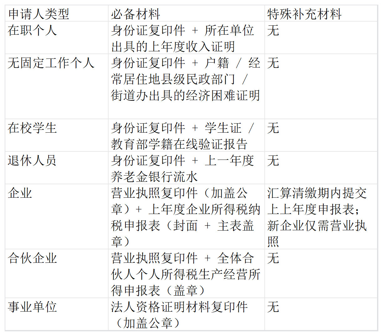 - 个人申请人:上一年度月均收入低于 5000 元(年收入≤6 万元)