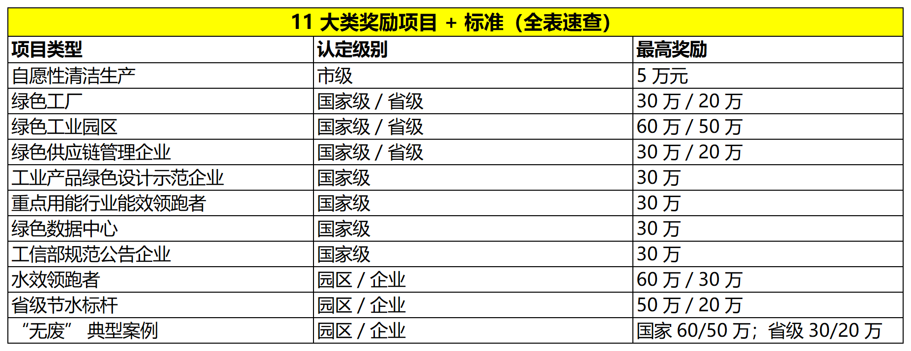 备注:对获得不同层级称号的,仅享受最高称号对应奖励。如企业既是省级绿色工厂又是国家级绿色工厂,仅按国家级称号最高给予一次性30万元的奖励;如此前已获得省级绿色工厂奖励,仅奖励最高10万元的差额。