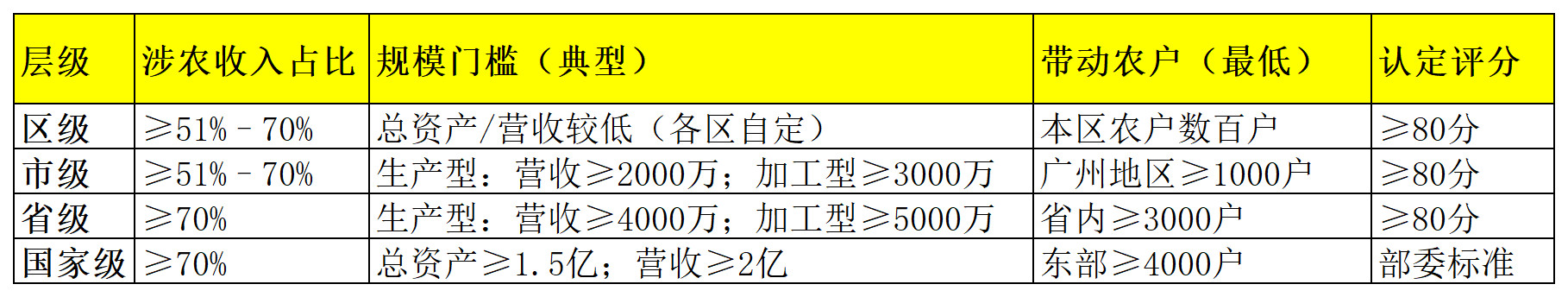 - 核心要求:广州全域注册,一般需先获得区级农业龙头企业资格;生产型企业年营收≥2000万元,加工型企业年营收≥3000万元,带动广州地区农户≥1000户,涉农收入占比≥51%-70%,资产负债率≤60%。