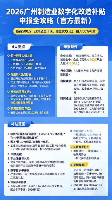 广州制造业企业注意!2026年中小企业数字化改造补贴全面升级最高奖补500万、政策延至年底、覆盖8大行业投入50%补助,真金白银帮企业减负转型这篇官方版申报攻略,看完直接上手申报